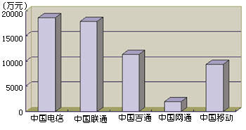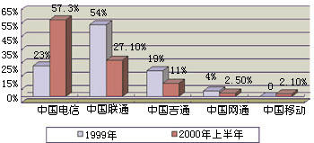 通過引入IP電話業(yè)務(wù),我國電信市場已經(jīng)形成了以中國電信、中國聯(lián)通、中國移動、中國吉通和中國網(wǎng)通等五大電信運(yùn)營公司為主體的新格局。他們各自的業(yè)務(wù)范圍不盡相同,但I(xiàn)P電話是他們相同的業(yè)務(wù)之一,所以這一市場相互之間的競爭較為激烈。圖1和圖2分別表示這五大運(yùn)營商在2000年上半年IP電話的話務(wù)量和收入。從圖中可以看出,他們在我國IP電話市場上所占據(jù)的地位和角色。