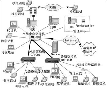 首信的IP-PBX解決方案如圖所示。以某局為例,市局與各分局之間已有寬帶網(wǎng),充分利用此帶寬以數(shù)字電話形式開展語音業(yè)務(wù)。數(shù)字電話的實現(xiàn)形式有:PC話機(jī)、數(shù)字話機(jī)、可視電話、通過模擬線適配器接入的模擬話機(jī),數(shù)字電話設(shè)備直接通過Hub與以太網(wǎng)交換機(jī)相連。數(shù)字電話通過IP電話網(wǎng)關(guān)與市局中心的程控交換機(jī)PBX相連,從而與現(xiàn)有的模擬話機(jī)相通。各種數(shù)字話機(jī)與內(nèi)部模擬話機(jī)間通話,都不需要付電話費,通過PBX撥打局外面的市話或長途電話時,與原來的模擬電話一樣付費。