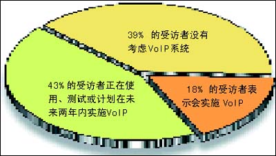 該調(diào)查收集了全球254名高級管理人員對未來企業(yè)網(wǎng)絡的意見和看法。其中,43%的受訪者表示,他們正在使用、測試或計劃在未來兩年內(nèi)實施VoIP;另外 18% 的受訪者表示,從長遠的角度來講,他們會實施 VoIP。市場預測也顯示相同的樂觀前景。研究機構Gartner Dataquest預期到2008年,公用電話交換網(wǎng) (PSTN) 的零售語音收入將輕微下跌,而VoIP的零售收入則上升 38.6%。
