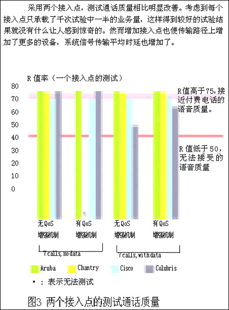 而其他供應商的設備在開啟QoS保障機制的情況下,一旦加入數(shù)據(jù)流業(yè)務,就很難保證通話質量。從正面來看,在只有語音傳輸業(yè)務的情況下,QoS保障機制一般運行較好。當我們只承載語音傳輸時,所有系統(tǒng)的音頻質量都改善了。在不加入數(shù)據(jù)流情況下測試6個或7個并行VoIP呼叫,所有的系統(tǒng)都能夠取得和付費電話一樣的通話質量。但當我們加入數(shù)據(jù)流業(yè)務,一切都改變了。在承載6個并行VoIP呼叫并加入數(shù)據(jù)流業(yè)務的情況下,Colubris CN1250系統(tǒng)的R值衰落到70以下。根據(jù)ITU的R值標準,這說明一些用戶的通話質量不令人滿意。Chanrty的R值在60左右,這個結果將不能令用戶滿意。除了客觀的R值評分以外,我們還進行了一些主觀的通信質量監(jiān)聽,當加入了數(shù)據(jù)流業(yè)務以后,我們聽到了大量的回聲,掉線頻繁。總之,只要測試點加入數(shù)據(jù)業(yè)務流,上面描述的情況就會出現(xiàn),通話質量通常變得惡劣。