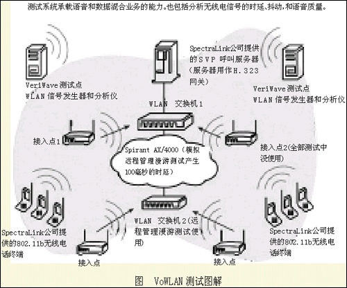 需要指出的是,我們的試驗設備是由VeriWave公司提供的。該公司是目前世界上領先的WLAN網(wǎng)絡及網(wǎng)絡設備的測試軟件提供商,而且專門針對VoWLAN開發(fā)了一套新的測試工具。除了可以搜集時延和抖動等數(shù)據(jù)參數(shù)外,這套工具還能為我們提供R值,即ITU的G.107標準。R值是一個客觀的測量參數(shù),主要用來判斷語音質量,是能根據(jù)丟包率、時延、抖動這些數(shù)據(jù)直接計算出來的。另外它和ITU 建議的P.800中的MOS(Mean Opinion Score)指標非常相關。因此,這套工具可以進行網(wǎng)絡故障定位、用戶投訴分析、系統(tǒng)評估、網(wǎng)絡優(yōu)化等。從用戶角度測試網(wǎng)絡或網(wǎng)絡參數(shù)(吞吐量,反應時間,時延,抖動,丟包等),非常適合我們這次試驗。
