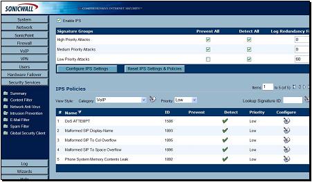SonicWALL入侵檢測服務(IPS)能夠為VoIP協(xié)議應用層提供全面保護。IPS集成了一個可配置的超高性能掃描引擎,配合動態(tài)更新和擁有1900多攻擊和漏洞簽名的數(shù)據(jù)庫,可以保護網(wǎng)絡免受最復雜的木馬和變形威脅的影響。SonicWALL已經(jīng)利用一系列VoIP相關的簽名來擴展其IPS簽名數(shù)據(jù)包,可以防止惡意業(yè)務流到達受保護的VoIP電話和服務器。