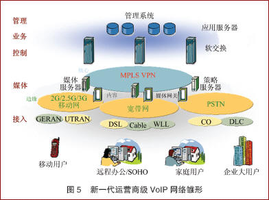 隨著以軟交換和MPLS/VPN兩項(xiàng)技術(shù)為核心的下一代網(wǎng)絡(luò)技術(shù)的不斷成熟和發(fā)展,將構(gòu)筑起新一代運(yùn)營(yíng)商級(jí)的VoIP網(wǎng)絡(luò)雛形,如圖5所示。