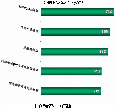 市場(chǎng)調(diào)研咨詢(xún)公司Yankee Group日前針對(duì)消費(fèi)者進(jìn)行了一次調(diào)查,結(jié)果顯示:73%的用戶喜歡VoIP是因?yàn)橥ㄟ^(guò)它可以進(jìn)行免費(fèi)的PC對(duì)PC通話;69%的用戶喜歡VoIP在線呼叫的功能;67%的用戶表示,VoIP廉價(jià)的通話費(fèi)用使人們可以無(wú)限制地通話,令人心動(dòng);61%的用戶表示,喜歡通過(guò)VoIP使電話與PC、其他在寬帶網(wǎng)絡(luò)上的一些活動(dòng)捆綁起來(lái);60%的用戶表示被服務(wù)提供商提供的優(yōu)惠套餐吸引。對(duì)于用戶來(lái)說(shuō),VoIP最大的吸引力似乎在于其低廉的話費(fèi)和為人們帶來(lái)的方便。