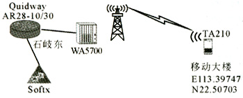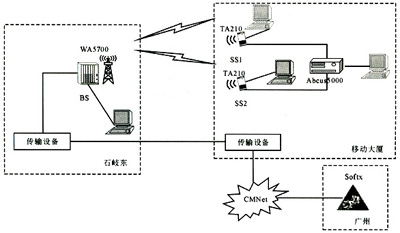 組網時,由于BS(石岐東)需要與廣州的SoftX連接,因此,實際組網方案通過傳輸設備連接公安局與移動大廈;然后通過移動大廈的CMNet網絡連接廣州的SoftX。在該個組網中,視距傳播環(huán)境通過固定在移動大樓支架上的遠端站實現(xiàn),非視距傳播環(huán)境通過移動的遠端站實現(xiàn)。