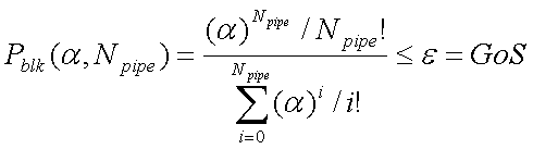 用 和 分別表示流量管道容量和每個(gè)呼叫所需帶寬,則流量管道可同時(shí)傳送的呼叫數(shù)目可表示為 。記 為呼叫阻塞的概率,則Erlang B公式可以表示為[6]: