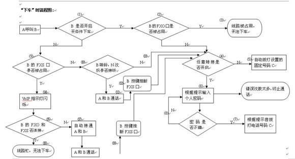 - 若A是為了下車,則B端接聽(tīng)方按鍵“*#*”切斷FXS通路,然后進(jìn)入⑷--⑻。