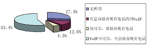 最近《華爾街日報》刊載了YankeeGroup公司的調(diào)查報告,對美國人使用VoIP的趨向和目前的一些應(yīng)用狀況進(jìn)行了統(tǒng)計(jì),重點(diǎn)調(diào)查了美國人是否要放棄傳統(tǒng)的固定電話而改用VoIP,具體數(shù)據(jù)參見圖1。從圖中可見人們對放棄固定電話而改用VoIP的意向還不是很高,但已使用VoIP的人群卻是個龐大的群體,使用VoIP的人口比例已達(dá)15.1%,現(xiàn)使用人數(shù)已達(dá)到了4500多萬戶,具體見表1。另外,目前美國VoIP已從暴利行業(yè)轉(zhuǎn)向微利行業(yè),這點(diǎn)可以從Skype公司收入得到證明,詳見表2。