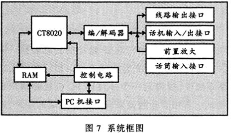 ——硬件平臺構(gòu)造于PC機上,采用ISA總線插卡方式,如圖7所示。該平臺采用了美國DSPG公司的專用數(shù)字信號處理器CT8020作為核心部件,利用先進(jìn)的可編程邏輯器件開發(fā)了外圍控制電路和接口電路。它主要完成以下功能。