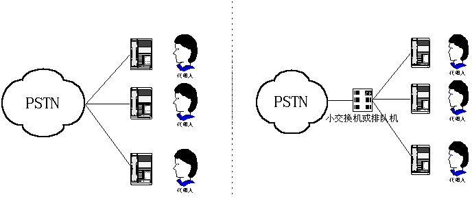 呼叫中心,早期是指一個由兩人或更多人組成的、在一個特定地方用專用設(shè)備處理電話業(yè)務(wù)的小組。這些人就是通常所說的呼叫中心代理(人)。一個呼叫中心可以只提供信息接收服務(wù),或者只提供信息發(fā)送服務(wù),或者是一個混合式呼叫中心,其呼叫中心代理會負責(zé)所有這兩項工作。從物理設(shè)備構(gòu)成來看,第一代呼叫中心可用下圖(1)、(2)表示。