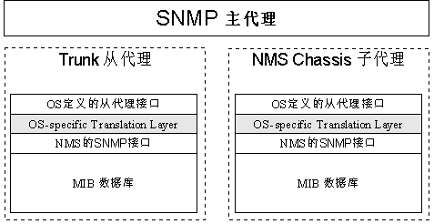 SNMP采用了Client/Server模型的特殊形式:代理/管理站模型。對(duì)網(wǎng)絡(luò)的管理與維護(hù)是通過管理工作站與SNMP代理間的交互工作完成的。每個(gè)SNMP從代理負(fù)責(zé)回答SNMP管理工作站(主代理)關(guān)于MIB定義信息的各種查詢。下圖10是NMS公司網(wǎng)絡(luò)產(chǎn)品中SNMP協(xié)議的實(shí)現(xiàn)模型。