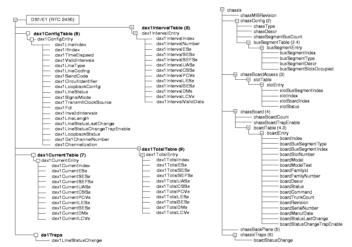 圖14中左圖給出了RFC2495對(duì)DS1/E1中繼線的MIB信息樹圖,右圖是NMS系統(tǒng)中對(duì)機(jī)架Chassis管理MIB約定。