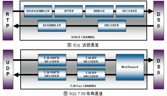 Fusion 提供了標準的MSPP通道類型以支持語聲編解碼和T.38傳真,且可由應(yīng)用程序按需調(diào)用接口函數(shù)創(chuàng)建單工或雙工通道來對數(shù)據(jù)進行處理,其中雙工通道實際上包含兩條單工過濾器鏈組。