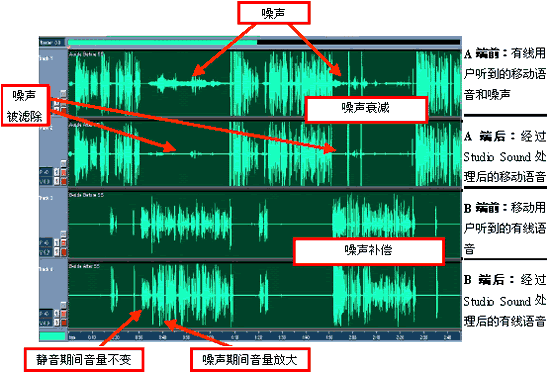 這里的結(jié)果顯示出,PSTN側(cè)收聽器接收到的噪音是如何被大大降低的,同時PSTN側(cè)說話的音量在無線側(cè)出現(xiàn)大聲的噪音期間被顯著地放大了。通過遍及全球的類似場合試驗(yàn),在應(yīng)用Studio Sound之前和應(yīng)用之后通話質(zhì)量的不同已經(jīng)深刻為許多業(yè)務(wù)提供商所了解。