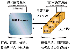 圖2畫出了第一代VoP網(wǎng)關(guān)典型的基于處理器的實(shí)現(xiàn)框圖,圖中利用通用DSP"場(chǎng)"來實(shí)現(xiàn)所有具體的DSP功能,利用通用RISC處理器來打包、匯聚和分發(fā)/路由尋找。(請(qǐng)參看補(bǔ)充材料<VoP技術(shù)>一文)。