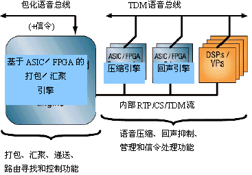 圖5畫出了這種技術(shù)實(shí)現(xiàn)的VoP系統(tǒng)框圖。圖中專用ASIC/FPGA引擎提供打包、匯聚、壓縮和回聲抑制功能。而DSP則用于信令功能,如音頻信號(hào)的接收和生成,DSP還用于開發(fā)商自定義功能。