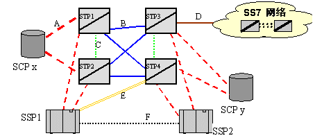 下圖顯示了各種類型的鏈路,各種類型的鏈路在物理上都是DS1或T1或E1中的一個時隙。這些鏈路類型 的定義和具體連接兩節(jié)點的鏈路配置有關(guān),定義這些鏈路類型的目的,是為了更好地管理網(wǎng)絡(luò),特別是為了減少網(wǎng)絡(luò)中斷的可能。為了提高網(wǎng)絡(luò)的可靠性,必需要有多個通道可以傳送消息。在ANSI和ITU-T的標準里,都有相應(yīng)的規(guī)則說明如何通過各種類型的鏈路傳遞消息,(如下圖所示的網(wǎng)絡(luò)中,當從SSP1往SSP2發(fā)消息時,首先試圖從A鏈路發(fā)送消息,如果消息發(fā)送不出去,再試從F鏈路發(fā)送)。以及如何避開網(wǎng)絡(luò)瓶頸傳遞消息。