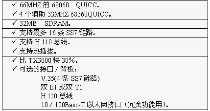 TX3000卡的功能大致和TX2000卡相同,但它比TX2000的性能2.5至5倍。TX3000卡上有一個(gè)66MHZ的68060協(xié)處理器。TX3000卡為SS7應(yīng)用配置1至4個(gè)QUICC通信控制器,最多16條信令鏈路,提供一個(gè)三口V.35,擁有雙T1或雙E1接口。(主板上標(biāo)準(zhǔn)配置一個(gè)QUICC,支持四條SS7鏈路,當(dāng)CT總線(xiàn)和串行接口都要使用,或者處理的鏈路超過(guò)4條時(shí),可先配置有三個(gè)QUICC的背板,四個(gè)QUICC可支持16條SS7鏈路)。