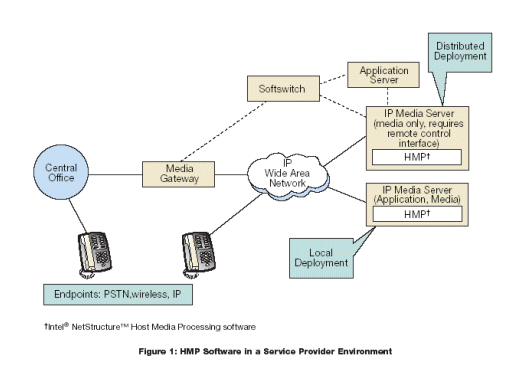圖1表示使用HMP軟件的IP媒體服務器,部署在典型的服務提供商環(huán)境的例子,包括IVR,通告,語音郵箱/消息,語音識別和會議服務器。