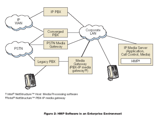 圖2表示使用HMP軟件的IP媒體服務器,部署在企業(yè)環(huán)境的例子,包括IVR,自動應答,語音郵箱,統(tǒng)一消息,語音識別和會議服務。