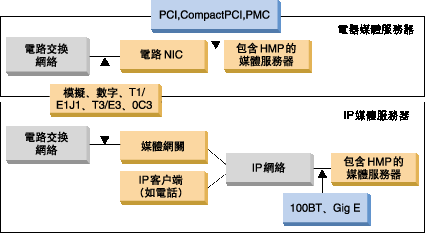 部署架構 模塊化的下一代網絡將語音和數(shù)據合并在單個包基礎結構中。這使目前的兩種主要架構可用于部署媒體服務;基于直通電路的網絡接口和基于包的IP網絡接口。下面的圖說明了這兩種架構。Dialogic