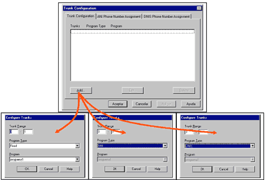 首先配置系統(tǒng)的中繼線(菜單 Project->設(shè)置中繼)。在中繼設(shè)置主窗口中,有一個TrunkConfiguration 選項卡。本選項卡用來設(shè)置每一通道應(yīng)用及其相關(guān)程序類型。共有3種程序:
