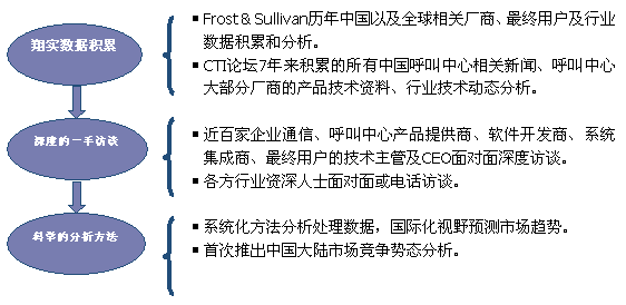 Frost & Sullivan 和 CTI論壇(m.bdqia.com)共同組成的調(diào)研小組,在查閱了大量資料的基礎(chǔ)之上,以企業(yè)通信及呼叫中心的設(shè)備應(yīng)用、投資計(jì)劃以及相關(guān)廠(chǎng)商的市場(chǎng)表現(xiàn)為出發(fā)點(diǎn),通過(guò)對(duì)企業(yè)通信及呼叫中心重要應(yīng)用企業(yè)、在市場(chǎng)占主導(dǎo)地位的二十多家設(shè)備廠(chǎng)商、二十多家軟件開(kāi)發(fā)商、十幾家系統(tǒng)集成商、數(shù)家外包運(yùn)營(yíng)商的深度訪(fǎng)談,參閱內(nèi)部相關(guān)報(bào)告及數(shù)據(jù)庫(kù),對(duì)數(shù)據(jù)的來(lái)源和數(shù)據(jù)的準(zhǔn)確性進(jìn)行了詳細(xì)核對(duì)與論證;憑借參與調(diào)研人員的多年從業(yè)經(jīng)